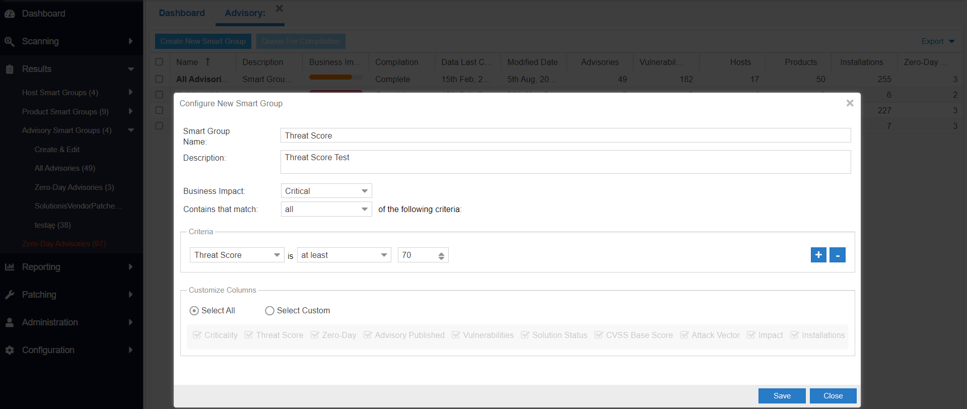 When creating the Advisory Smart Group , the Threat Score option is available for the Criteria specification. The result is displayed based on the selection. By default, the Threat Score Criteria is set to 70 .