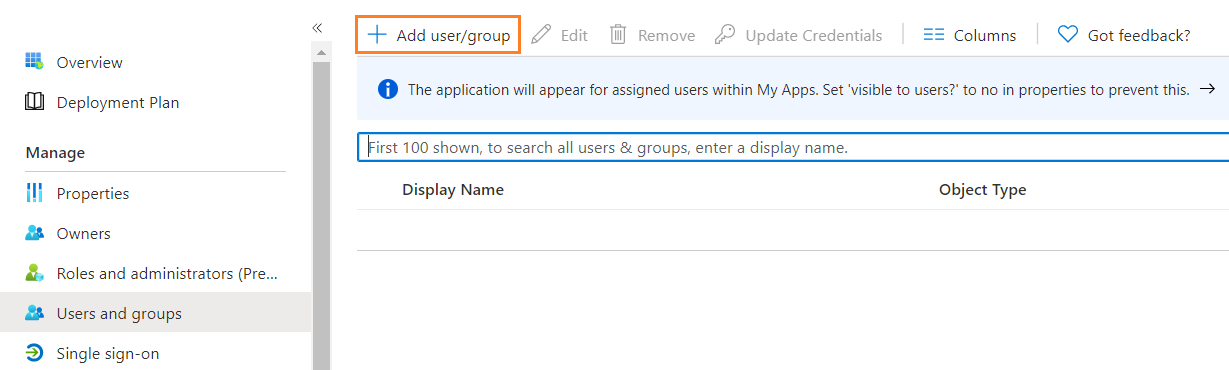 To assign users or groups to the enterprise application, perform the following steps.
