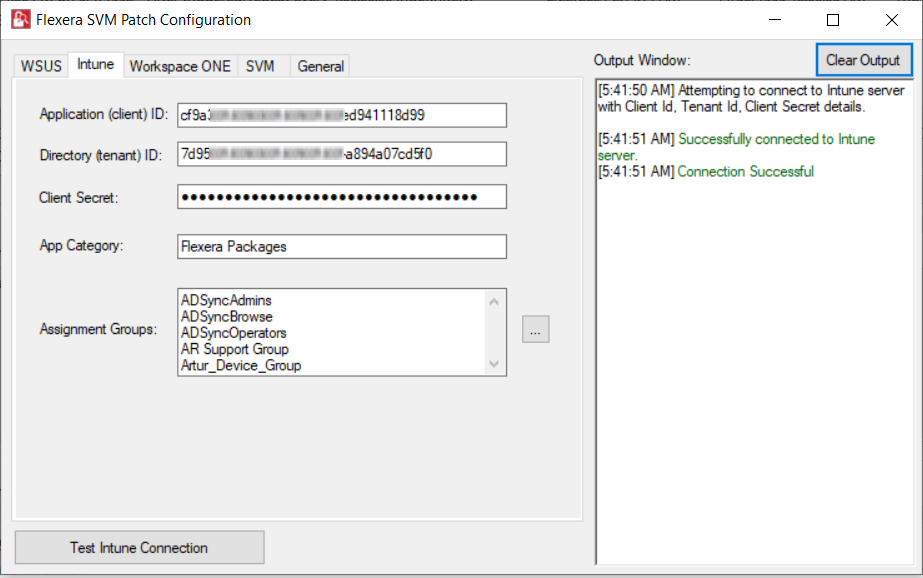 - Click Test Intune Connection button, on successful connection you will receive a successful message in the Output Window.