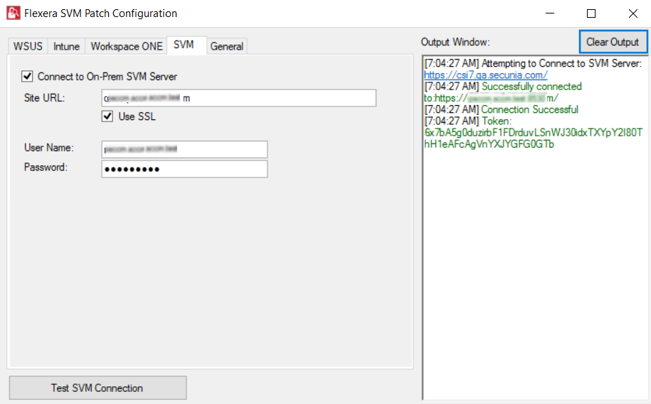 - Click Test SVM Connection button, on successful connection you will receive a Token in the Output Window.