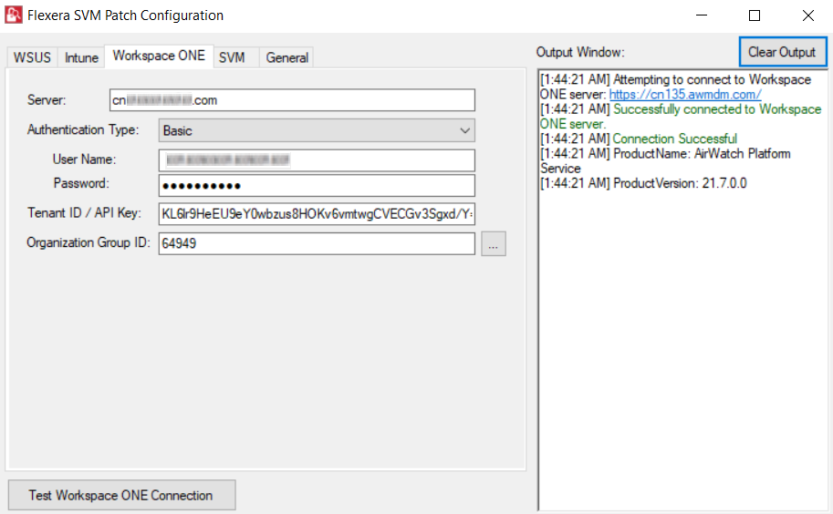 - Click Test Workspace ONE Connection button, on successful connection you will receive a successful message in the Output Window.