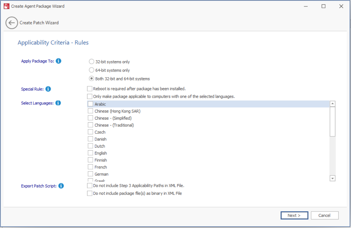 | Apply Package To | Select one of the required package limit: 32-bit system only 64-bit system only Both 32-bit and 64-bit systems |