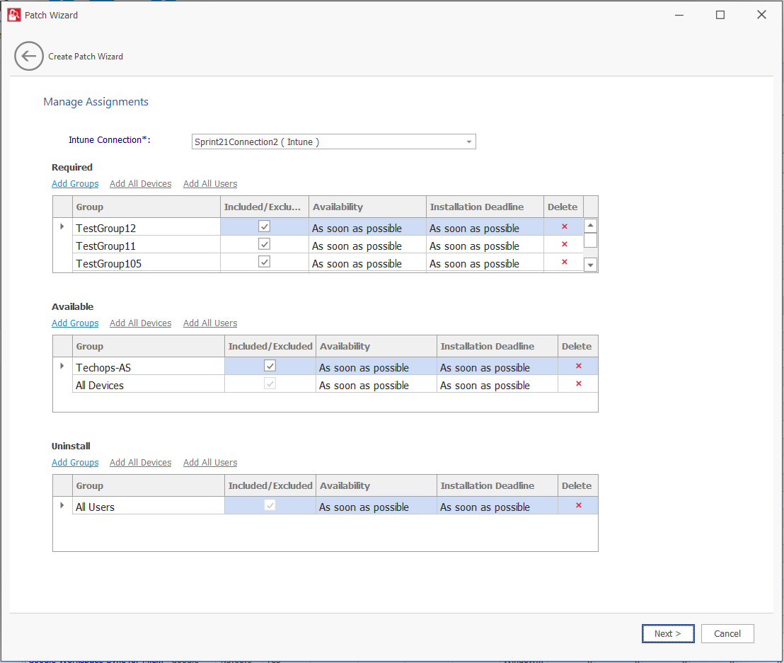 | Required Available Uninstall | Configure the following details: Add Groups Click on Add Groups , and the Intune Assignment Groups dialog box will appear. Select the required group from the list or enter keywords in the Search Text box, and then click Search button to display matching entries in the grid. Select the desired group(s) from the list. You can select multiple groups. Click the Next button to proceed to the next page and the Previous button to go back to the previous page. After selecting the required groups, click OK and exit the dialog box. You can include or exclude the selected groups by clicking the Included / Excluded check box. To remove a selected group, click the delete icon in the Delete column. Add All Devices Click on Add All Devices to include all available devices. To remove added devices, click the delete icon in the Delete column. If All Devices is already selected, the hyperlink will be disabled from all the sections (Available, Required, and Uninstall). The option will only be enabled again once you delete the selected All Devices . Add All Users Click on Add All Users to include all available users. To remove added users, click the delete icon in the Delete column. If All Users is already selected, the hyperlink will be disabled from all the sections (Available, Required, and Uninstall). The option will only be enabled again once you delete the selected All Users . |