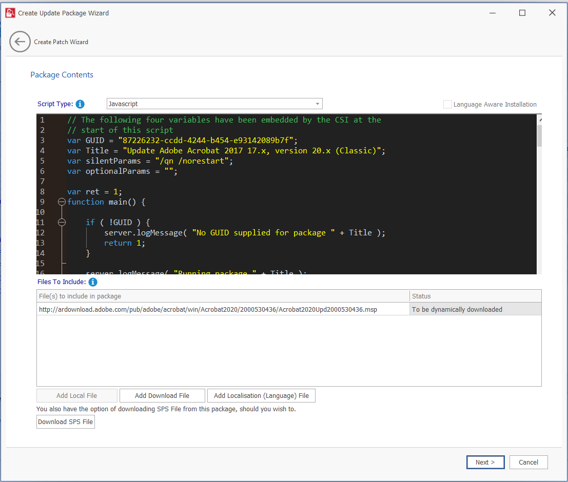 | Files To Include | You are also able to change the files that are included in the SPS package, which can either be local files or links to be dynamically downloaded upon publishing of the package. You need to update the script accordingly. Click on the Add Local File button and select the required file that you want to add for the selected path from the local/shared folders. |