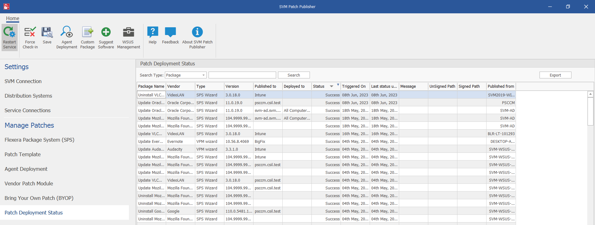 The Patch Deployment Status view displays the status and other details of the patches published to an endpoint management system.