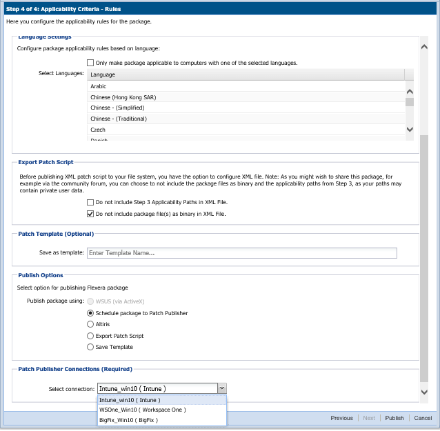 To publish a package through the Patch Publisher, select the Publish Options > Schedule package to Patch Publisher , and then select the required connection from the Patch Publisher Connections (Required) drop down.