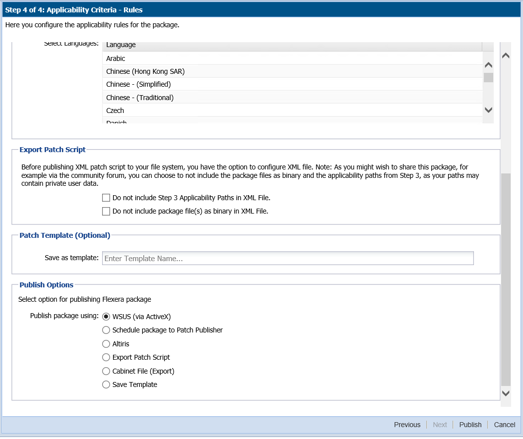 In Step 4 you should specify if you want to limit the package to 32-bit or 64-bit systems or computers with specific operating system languages. The patch file to be deployed will be automatically downloaded in the background by the Software Vulnerability Manager console. Once this is completed the Software Vulnerability Manager console will repackage and publish the update package into the WSUS/System Center. To export a package select File System (Export) and click Publish .