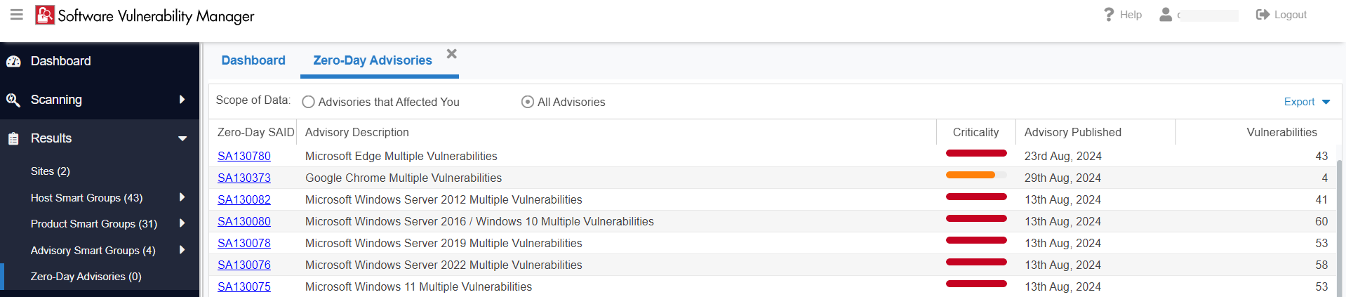 • Shows a filtered list of zero-day advisories that have specifically impacted your environment.