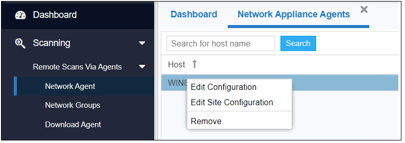 Use this page to view a list of the hosts which have Network Appliance Agents installed. Right-click a host to configure the Network Appliance Agent installed on that host.
