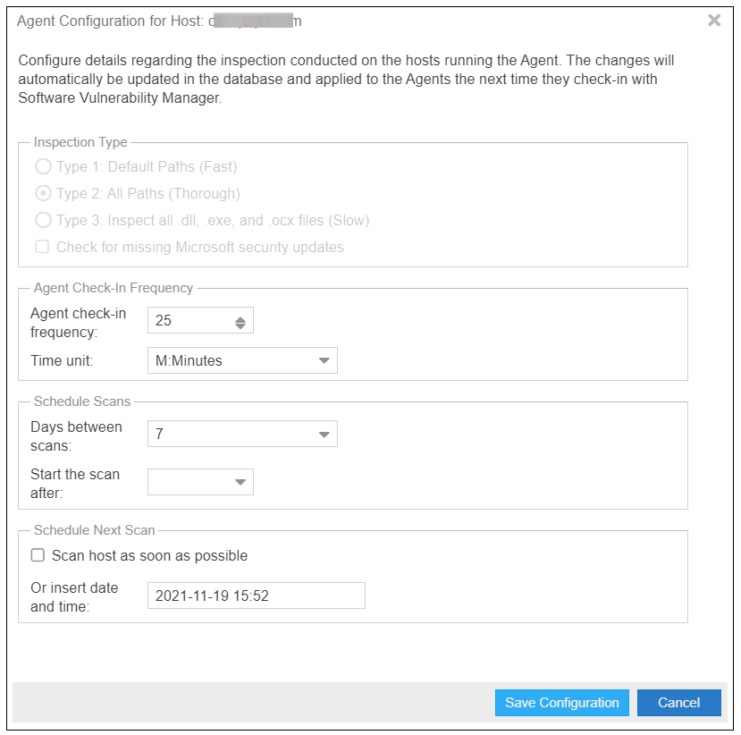 - The scan configuration settings set on the Software Vulnerability Manager website are not automatically transmitted to the agents. The agents have to connect to the Software Vulnerability Manager website as per their prior scheduled Agent Check-In Frequency before the agents become aware of the new scan configuration edits.