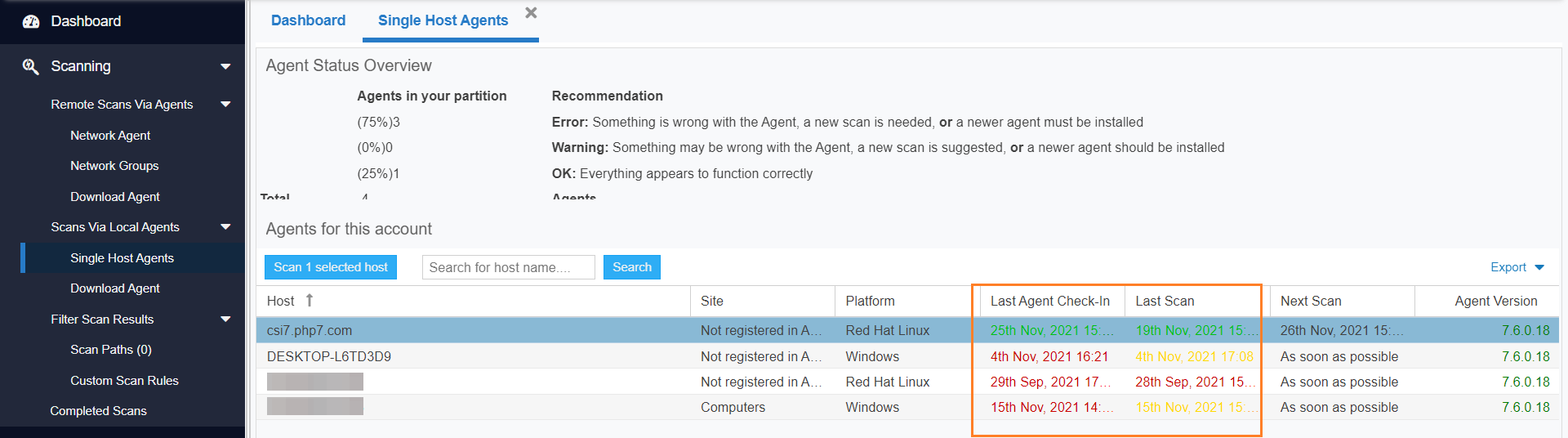 - Any edits made to the Agent Check-In Frequency option or selecting the Schedule Next Scan option Scan host as soon as possible will come into effect only after an agent has checked in as per the previously set scan frequency.
